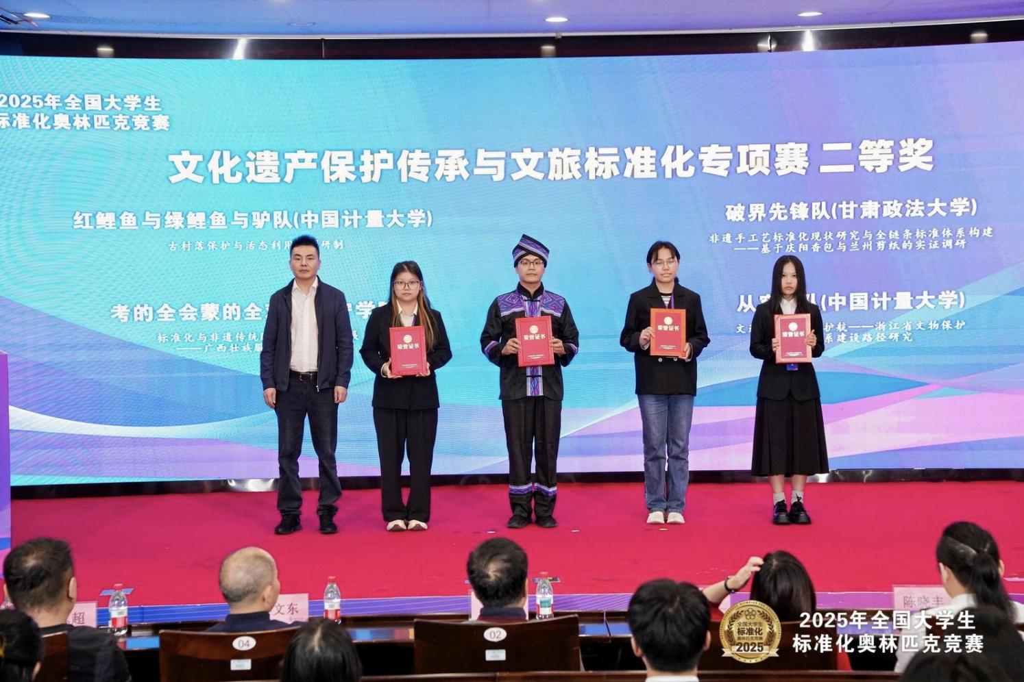 本次竞赛由陈嘉鑫、苏紫敏老师指导的队伍,针对壮族非遗服饰及其技艺传承流程规范等痛点,提出了一套可量化的标准化解决方案。由陈嘉鑫、张倩勉老师指导的队伍则瞄准数字要素与AI标准化前沿,围绕制造业QMS数据标注与交换规范等议题,构建了相关标准体系框架。